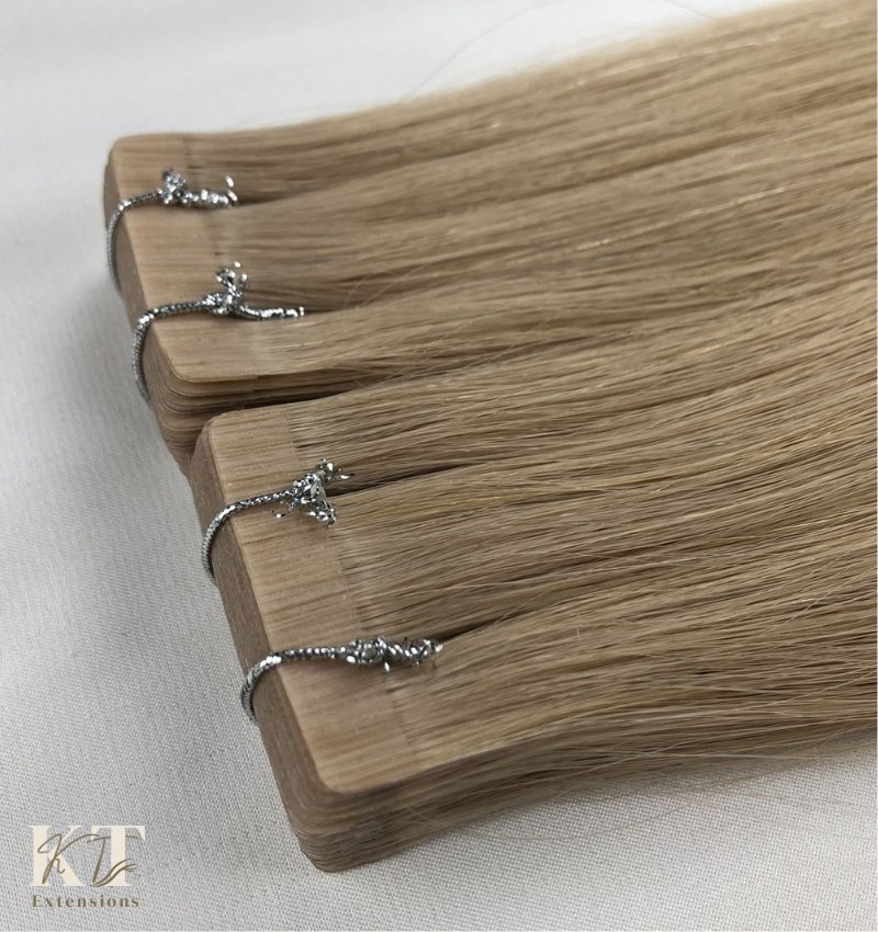 Les KT Extensions – Tape-in Couleurs Châtain sont des extensions adhésives lisses de qualité professionnelle,